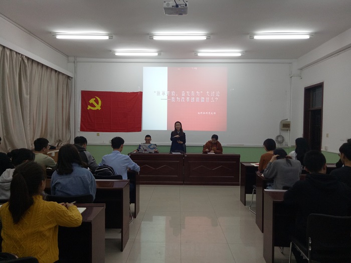 2019年4月16日,地科本科党支部在致明楼208会议室召开“我为改革创新做什么”大家谈主题党日活动。地科本科党支部全体党员参加了会议,会议由党支部书记贺雨濛主持。她提到,身为党员要提高政治站位,聚焦“六个破除”,深挖思想根源;支持和鼓励大家勇于担当,善于作为,主动作为,扎实开展“改革创新,奋发有为”大讨论,把大讨论要求和目的落实在具体工作中。