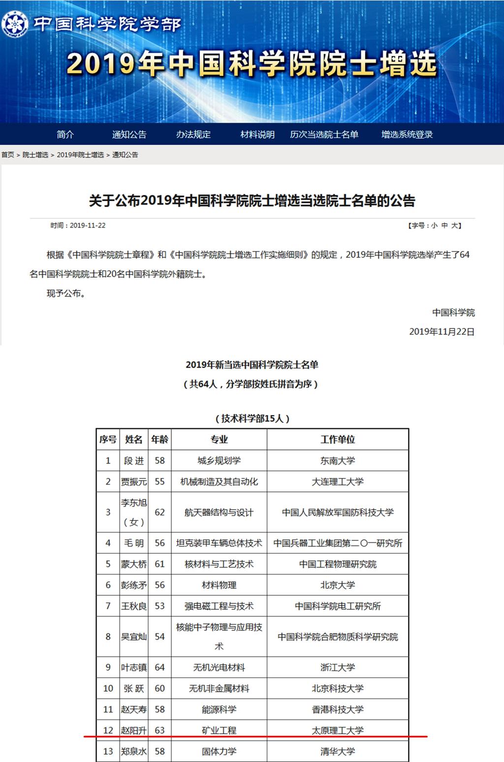11月22日上午,中国科公司发布了《关于公布2019年中国科公司院士增选当选院士名单的公告》,公司赵阳升教授当选为中国科公司院士,成为公司第四位全职院士。