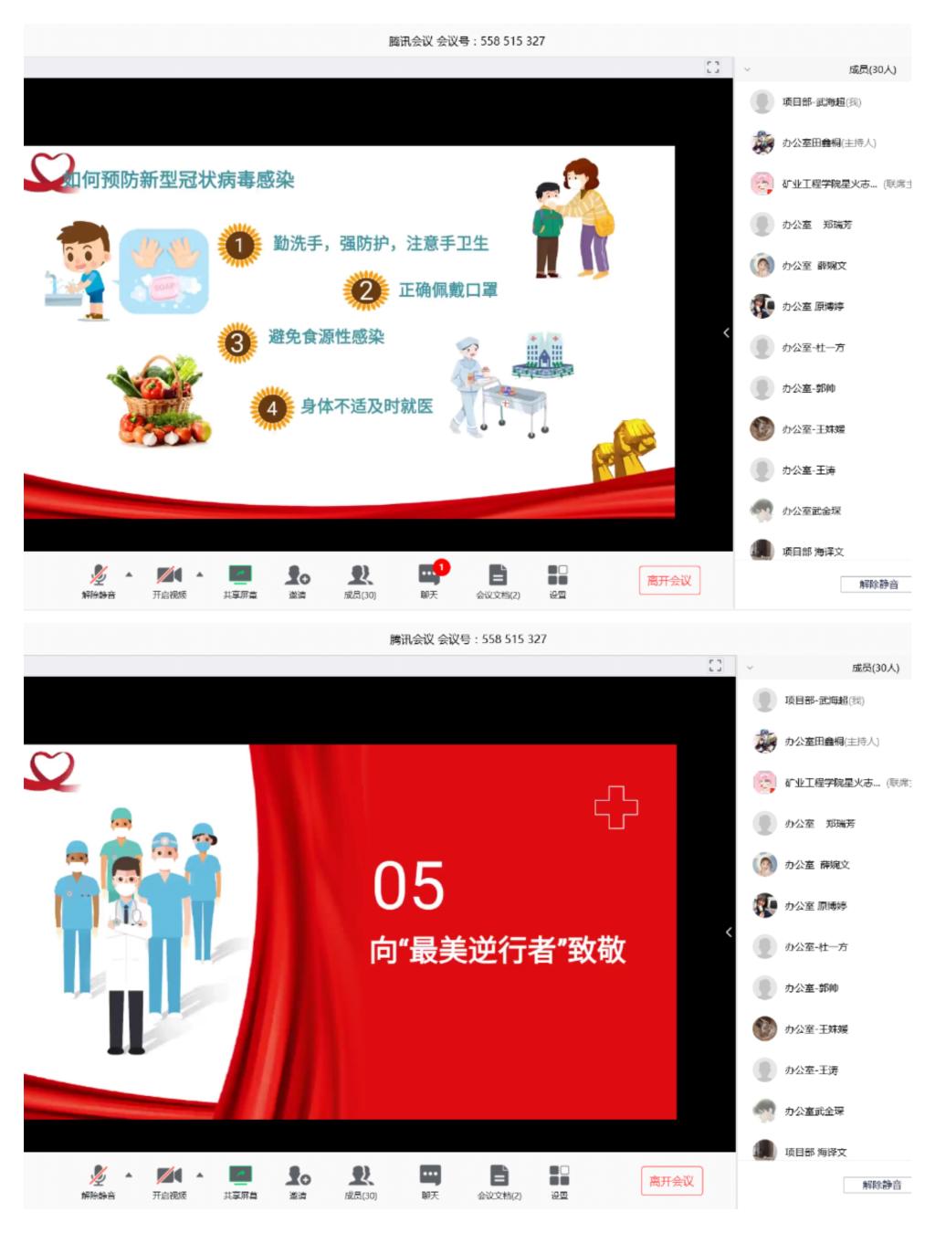 上官佳乐以共享屏幕向成员们讲述了疫情当前,我们应该做什么、怎么做,如何在严峻形势下培养爱国情怀。