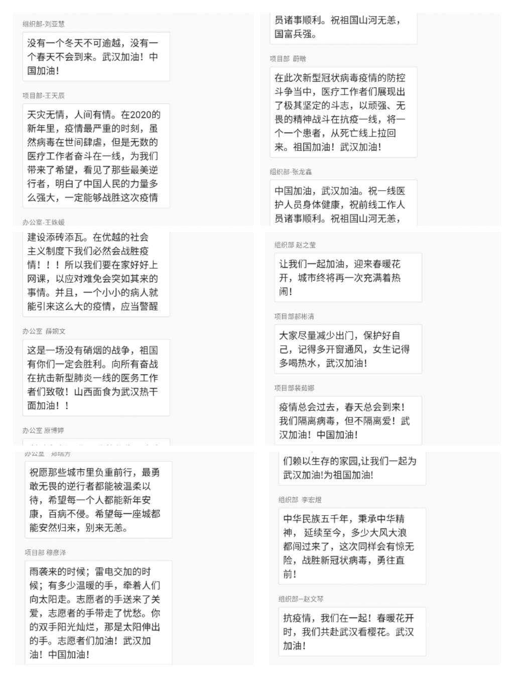 最后,服务队成员们用自己最赤诚的感情抒发了自己对疫情终将结束的必胜信念,以及对逆行者的感激与敬佩,这次抗疫涌现出的一批批勇士们,是新时代的雷锋,是新时代的榜样,他们挺身而出,勇担重任,中华民族历经数千年挑战屹立不倒,靠的就是这种自强不息,敢为人先的骨气。“士不可以不弘毅,任重而道远”,新时代的青年,更要经风雨,见世面,壮筋骨,长才干,担起时代责任,为中华民族伟大复兴贡献力量。