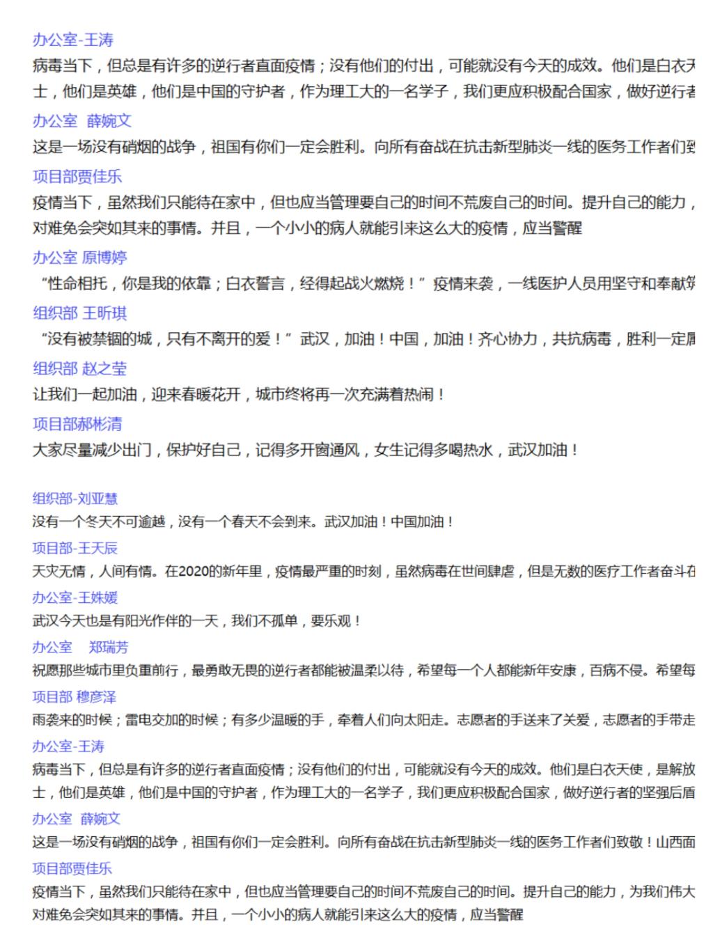 成员们就最近挺身而出奋斗在一线的“最美逆行者”们抒发了敬仰之情,这些人让我们每一个人都深切体会到无处不在的“雷锋精神”,大家表示只有积累知识,励精图治,才能在实际行动中发挥新时代青年的作用,其中一些成员敢为人先,加入一线,成为抗击疫情的志愿者,彰显雷锋精神,为抗疫贡献了自己的力量。