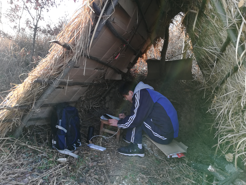 “天气好的时候,还挺好的,下雨天,真的非常冷,风也很大,走到草棚里鞋子都湿透了,就比较冷了”邹正伟说。这三个星期,邹正伟按时参加了公司的网课运行和在线班会,虽有卡顿,但是总体影响不大。下午也有课的时候,中午就不回家,从早上八点到下午五点都在草棚教室中度过,趁着中午空余的时间,写一写作业、记一记笔记,再捡点干柴,一个馒头,一杯水,就是一顿午餐,一般下午上完课,回了家天都黑了。