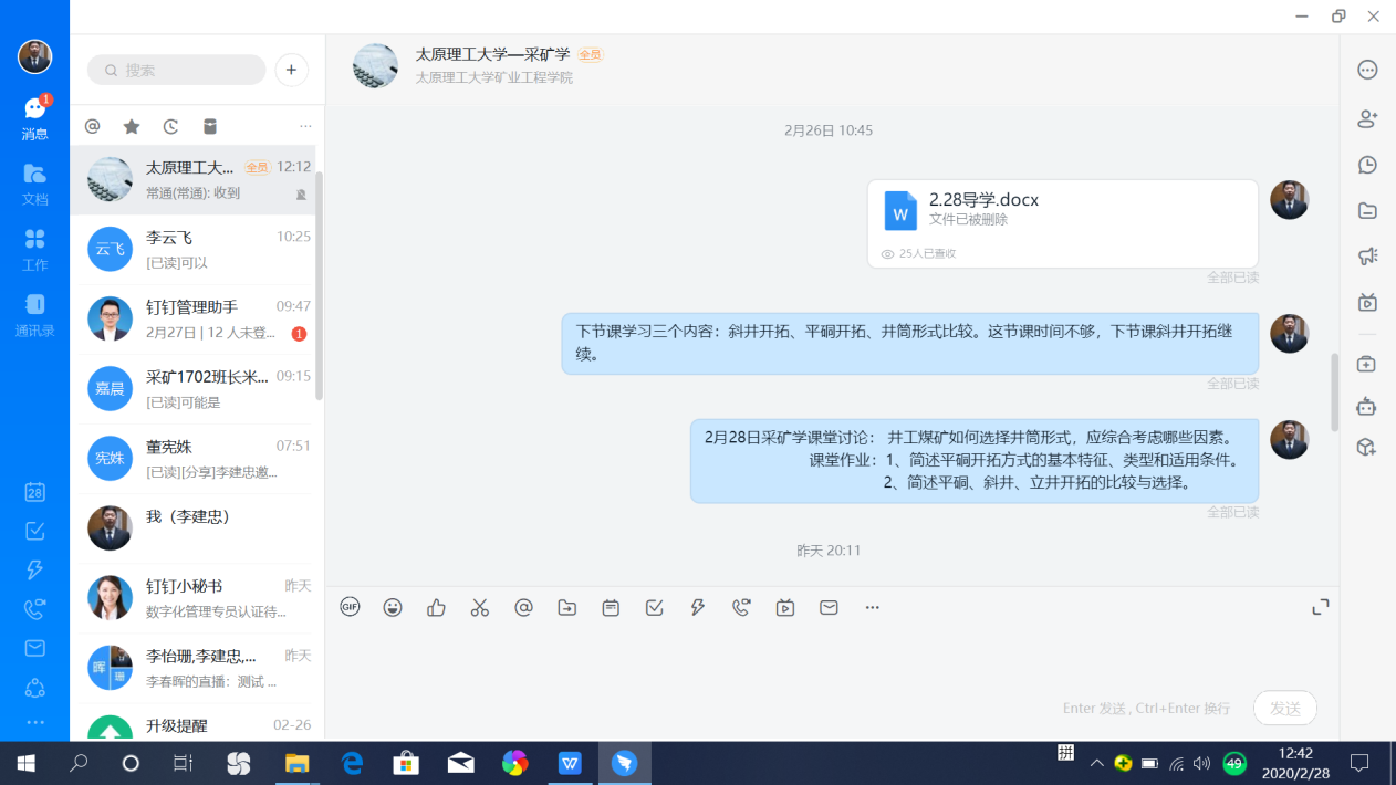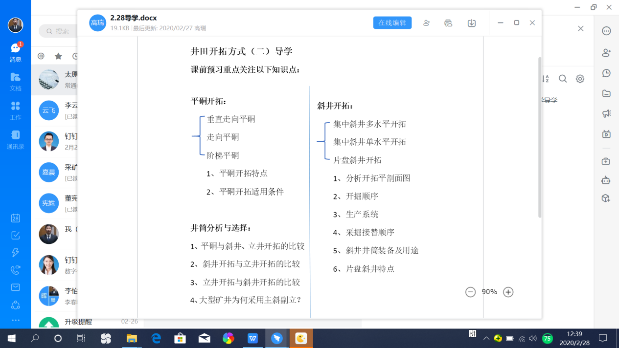 课程组教师在开学前精心准备,积极寻找可利用的网络教学资源,分析网络资源与本课程的配套关系,共同商讨疫情期间特殊的教学计划、授课方式、课程安排、考核方式等事项,制定统一的授课标准和考核标准,根据各自特点开展灵活的授课方式,保证7个班的教学内容、授课进度保持一致,并提前在学习通、微信群、钉钉群向员工发布教学安排,让员工明确新学期《采矿学A》课程的整体教学计划,方便员工制定相应的学习计划。