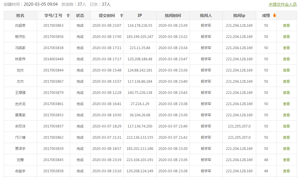 在网上布置作业和提交作业是一个很不错的形式,教师评判完作业后,系统能自动加分和排序,省却了教师平时收发作业、保存作业和加分排序这些简单费时的工作,同时员工可快速根据老师公布的答案纠正自己的不足。图 8是其中一次的作业完成和评分情况。