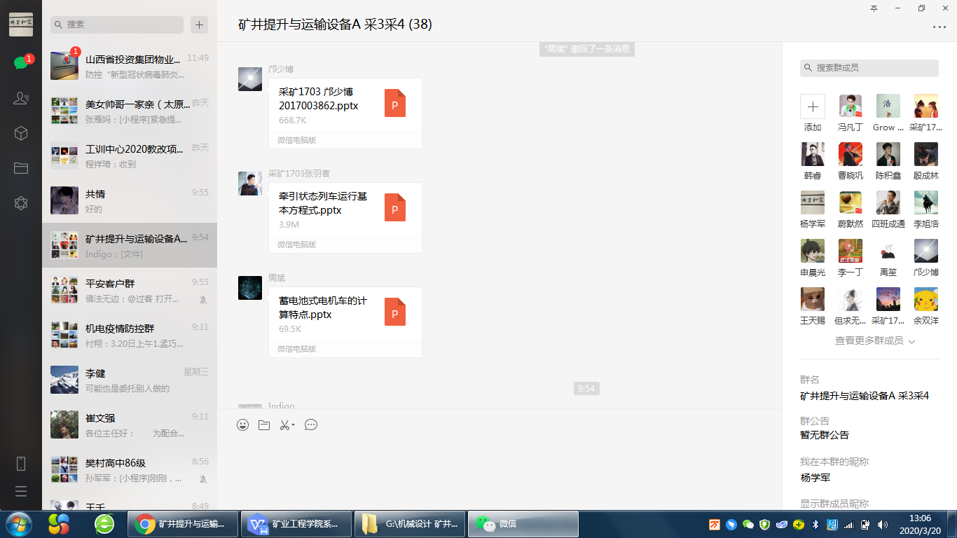《矿井提升与运输设备A》为采专业必修的一门专业基础课,其中理论教学任务为12周,36学时,本学期由孟巧荣、王爱玉和我共同承担7个班的教学任务。在当前特殊情况下,我们按照公司“停课-不停学-不停教”的工作部署,已经按照原定教学内容和教学计划开展了网络教学。目前,课程网络教学运行正常、教学效果良好。现主要采用的上课的方式是:课前录制教学视频,超星学习共享资料,课堂引导员工观看,腾讯会议互动答疑,微信群里交流通知,网络手段综合管理。现就过去5周的教学体会同大家分享,不足之处,请老师和同学们多提宝贵意见和建议。