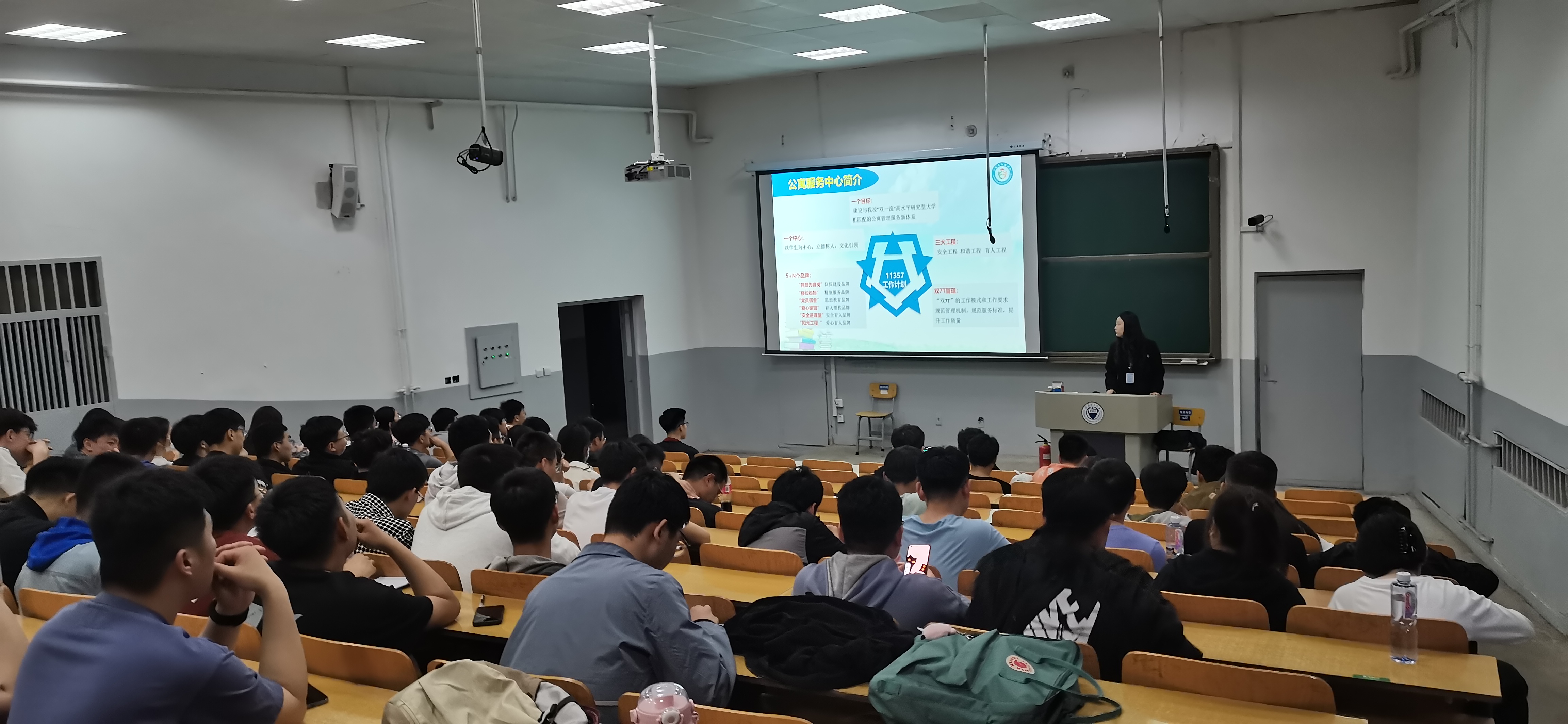 公寓中心曲兆捷老师、王埼煊老师从全心全意服务同学的视角出发,详细介绍了公司公寓服务中心“11357”发展计划和服务模式,并从“宿舍安全、防火安全、防盗安全、饮食安全、防自然灾害、疾病预防、防电信诈骗、防校园贷”八大方面入手,生动普及了防灾减灾知识和防范应对技能,增强了同学们的灾害风险防范意识和素养,使防灾减灾知识深入人心。同时,还互动性地向同学们演示了如电梯下坠保护、失火逃生等一系列简单实用的方法。通过实例演示,同学们加深了对简单自救措施的了解,一定程度上提升了面对灾情的自救能力。
