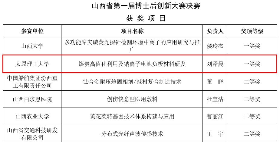 近日,由山西省人力资源和社会保障厅主办的“博揽青年英才,创新引领未来”首届山西省博士后创新大赛圆满落幕。球友会刘泽晨(博士后)、董宪姝、樊玉萍、马晓敏等组建的科研团队凭借参赛项目《煤炭高值化利用及钠离子电池负极材料研发》勇夺大赛“一等奖”。