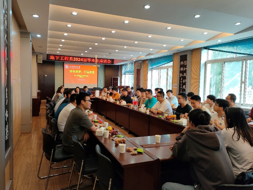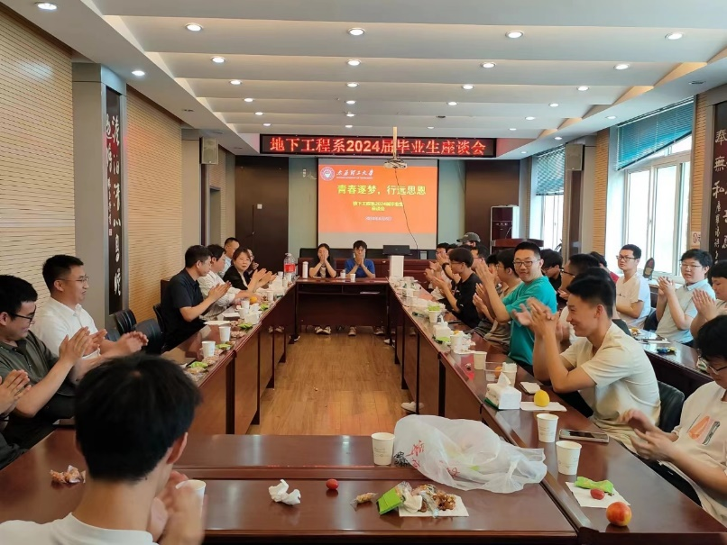 参会的毕业生们踊跃发言,和老师们回顾了在校期间的学习、生活、考研经历,也展望了今后的工作与发展,同时感恩母校和老师的培养,表示今后一定牢记老师们的嘱托,传承地下工程系的优良作风,认真工作、努力奋斗,取得优异成绩回报社会、回馈母校。高妙玲副书记认真倾听了同学们的意见和建议,并一一进行了回应。郭育霞主任针对同学们提出的专业相关问题,表示会认真组织讨论同学们的建议,继续提升地下工程系的教学质量,也希望同学们青春逐梦,行远思恩,关心母校发展。其他与会老师们也结合自己的经验积极为同学们答疑解惑,给毕业生今后的工作生活提供了许多宝贵建议,同时为即将毕业踏上新征程的同学们送上了美好祝愿,希望同学们能够不负韶华,勇敢地追逐自己心中的诗和远方,也希望同学们能感恩母校、珍惜师生情谊和同学友谊。