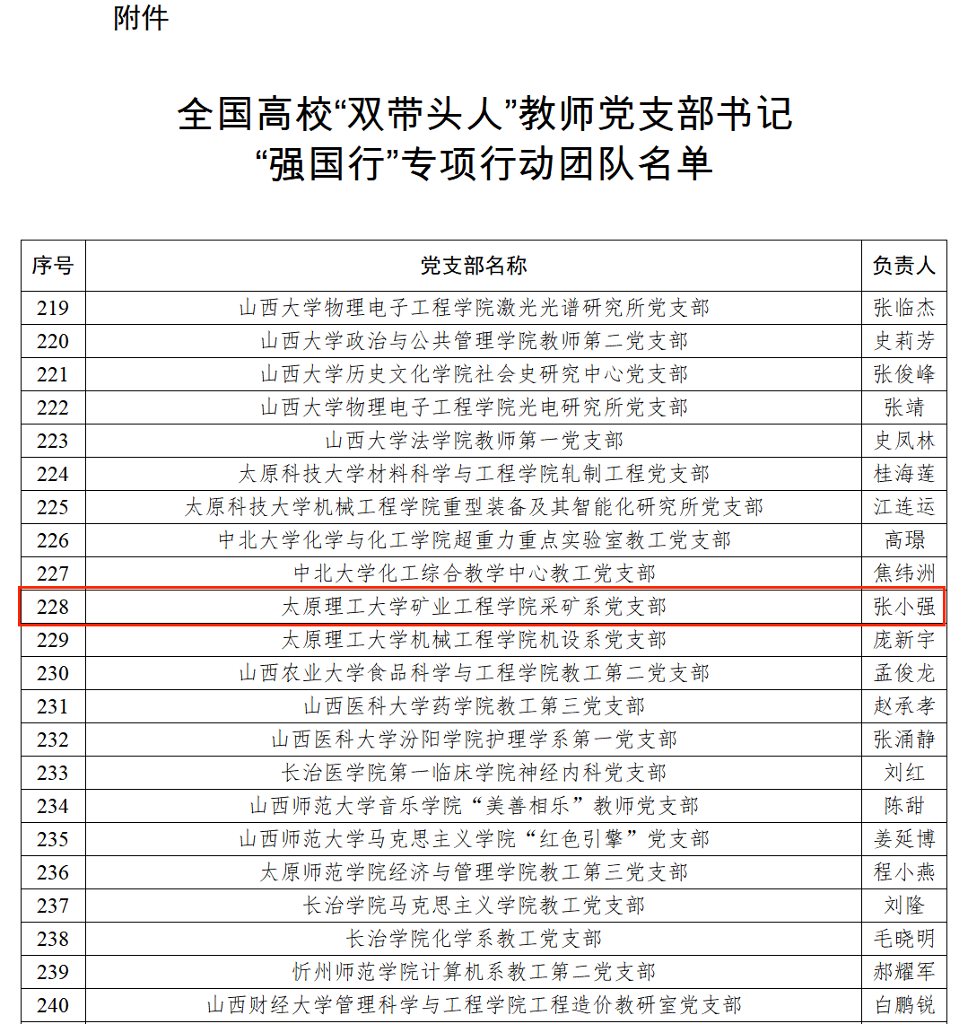 近日,教育部发布《教育部办公厅关于公布全国高校“双带头人”教师党支部书记“强国行”专项行动团队名单的通知》(教思政厅函〔2024〕15号),经各高公司党委审核把关、省级党委教育工作部门择优推荐、专项行动办公室备案审核、结果公示,1486名高校“双带头人”教师党支部书记入选全国高校“双带头人”教师党支部书记“强国行”专项行动团队。球友会采矿系党支部书记张小强成功入选,这是继采矿系党支部通过首批全国党建工作样板支部验收和被授予“全国先进基层党组织”称号后的又一国家级荣誉,充分展现了该党支部党建工作及党建引领业务的卓越成效。
